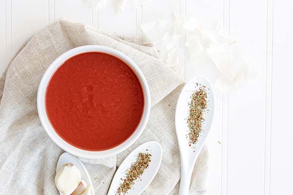 Heize den Backofen auf 200 Grad Ober- und Unterhitze vor. Lege nun die Tomaten und die Zwiebeln sowie den Knoblauch auf ein mit Backpapier ausgelegtes Backblech. Dem Knoblauch schneidest Du vorher die Oberseite ab, sodass die einzelnen Knollen sichtbar werden. Beträufle alles mit Olivenöl und Salz und schiebe es für 30 Minuten in den Ofen. Lass die Zutaten etwas abkühlen und gib diese in einen Mixer mit der Kokosmilch und der Gemüsebrühe. Wenn Du die Suppe gerne heißer magst, kannst Du sie in einem Topf erhitzen. Anderenfalls kann sie mit etwas Basilikum garniert serviert werden.